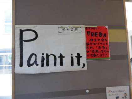 3年生の学年目標は「Peint it,・・・」です。「・・・」に今、学年で一丸となって取り組むべきことを色で表し、学年全体をみんなで協力しその色に染め上げるという想いをこめます。今回は、中間考査終了後は体育大会に向け「RED」・熱い心、情熱をもって体育大会を成功させようという想いが込められています。体育大会、頑張りましょう!でも、まずは明日の中間考査ですね。
