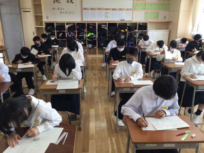 5月19日(木) 1年 中間考査1日目 公開日 2022/05/19 更新日 2022/05/19 1年生 写真上 1限 1年1組(国語) 写真下 1限 1年2組(国語) 中学生になって初めての定期考査でした。真剣に取り組んでいました。