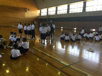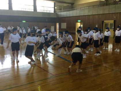 1学年の学年種目は、「台風の目」です。競技の内容についての説明の後、各団でチームや走順を決めました。その後、試しに走ってみました。今日は、白団が速かったですが、本番はどうなるでしょうか。どの団も心を1つに頑張ってほしいです。