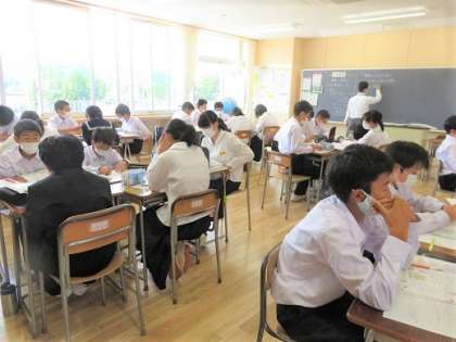 1年1組は家庭科の授業で「健康で快適な室内環境にするために大切なこと」を勉強しました。学習プリントを用いながら、班で学習内容を確かめています。班員の発言を促すリーダー性を発揮する生徒もいました。