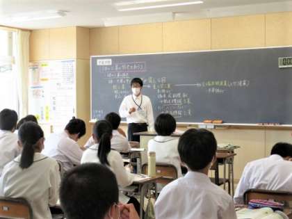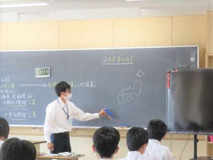 2年2組の社会の授業は「日本の工業の特色」の変遷について学習しました。旅行先で見たこと、ドイツのゴミ処理事情など、生徒たちの話題は多岐にわたり豊富です。また、「日本地図を5秒で描くコツ」についても話が及んでいました。
