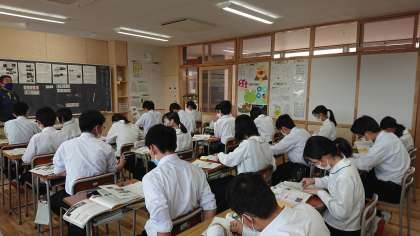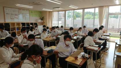5月27日(金) 3年生「授業風景その1」 公開日 2022/05/27 更新日 2022/05/27 3年生 3年1組は社会の授業です。 第2次世界大戦中の内容について学習しています。重要項目をペアになって確認しています。