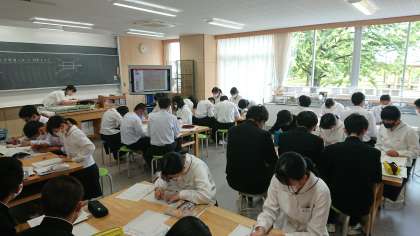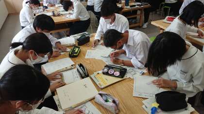 5月27日(金) 3年生「授業風景その2」 公開日 2022/05/27 更新日 2022/05/27 3年生 3年2組は美術の授業です。 一点透視図法を利用して、自分の部屋のデザインを考える内容を学習しています。