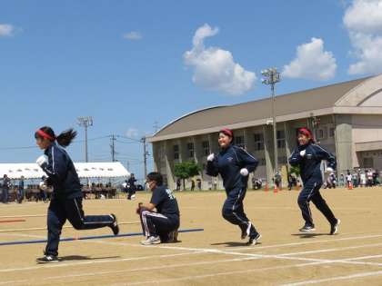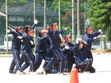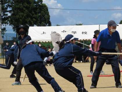 3年女子は「綱取り合戦」で、ユーモアあるかけ声を工夫しました。