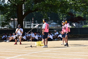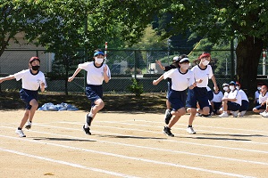 いよいよ100m走がはじまります。1年女子は、出発係の合図を緊張しながら待っています。