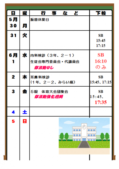 1週間のお知らせ(訂正 最新版) 公開日 2022/05/29 更新日 2022/05/29 お知らせ※2024以前 5月30日(月)〜6月5日(日)までの主な行事予定です。6月1日(水)は部活動がありません。また、スクールバスの時間も変更になっています。