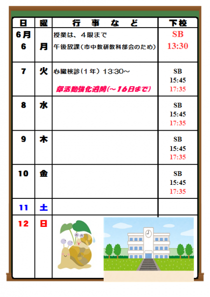 6月6日(月)〜6月12日(日)までの主な予定です。