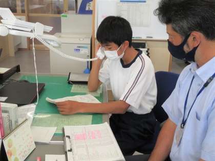2学年は、「社会に学ぶ『14歳の挑戦』」実施に向けて、着々と準備を進めています。今は、事前訪問の日程を事業所ボランティアの方と確認しています。あらかじめ電話で話すことを考えてはいるのですが、改まった電話をかける経験は初めてなので、かなり緊張している生徒が多いようです。