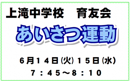 6月13日(月)育友会あいさつ運動 公開日 2022/06/13 更新日 2022/06/13 お知らせ※2024以前 6月14日(火)、15日(水)の朝、育友会(PTA)のあいさつ運動が行われます。 生徒会主催のあいさつ運動は先週金曜日から始まっています。コラボ企画としてパワーアップした元気な活動になりそうです。