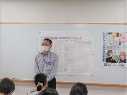 6月24日(金)午後7時から、会議室で「社会に学ぶ『14歳の挑戦』」保護者説明会とボランティア打合せ会を開催しました。全国に先駆けて富山県が始めたこの事業の説明を校長が行い、2学年担当者からは、活動の概要説明をしました。