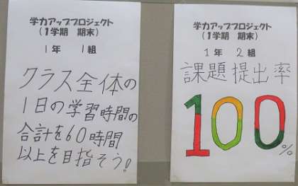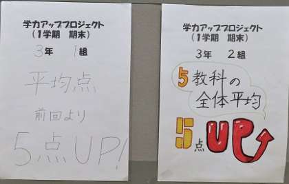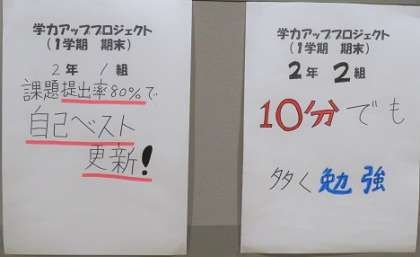 6月27日(月)期末考査1日目 公開日 2022/06/27 更新日 2022/06/27 お知らせ※2024以前 本日から、29日水曜日まで1学期期末考査です。「上滝中 学力アッププロジェクト」として、各クラスで目標を決めました。毎日暑いけれど、目標達成に向けてみんなガンバレ!
