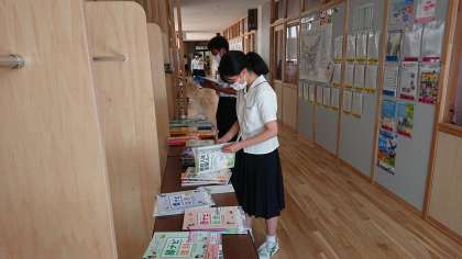 3年生の廊下に、これから進める自主課題に向けての参考書を掲示しています。