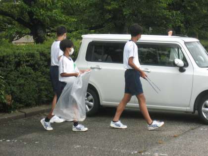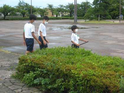7月4日(月)2年生「社会に学ぶ『14歳の挑戦』」 公開日 2022/07/04 更新日 2022/07/04 2年生 「富山県総合体育センター」さんにて。 利用者の方が気持ちよく使用されるように、施設周りのゴミ拾いを行っていました。