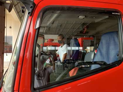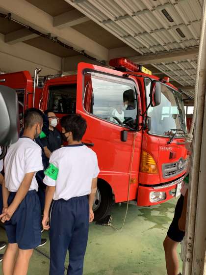 7月4日(月)2年生「社会に学ぶ『14歳の挑戦』」 公開日 2022/07/04 更新日 2022/07/04 2年生 「大山消防署」さんにて。 消防車に乗車して、操作等のしくみについて学んでいました。消防に関する知識が一気に増えました。
