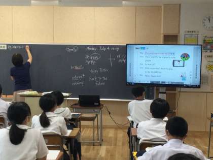 デジタル教科書を使って授業を進めています。今日の内容はWhatやWhoを用いて、部活動についてインタビューする学習の1回目でした。
