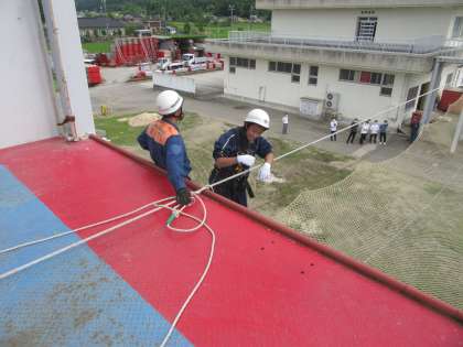 高い訓練棟に登り、命綱を装着して腕の力だけでロープを渡る訓練を行っていました。