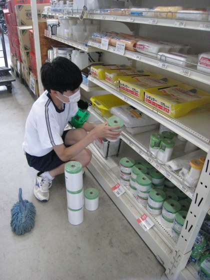 7月6日(水)2年生「社会に学ぶ『14歳の挑戦』」 公開日 2022/07/06 更新日 2022/07/06 2年生 「コメリ大山店」さんにて。 ハンドモップを用いて棚の掃除をしていました。 商品を1個ずつ取り出しながら丁寧に行っていました。