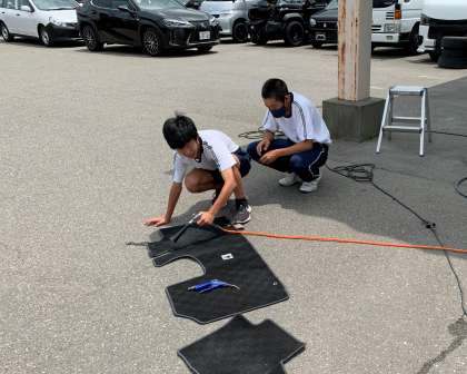 7月6日(水) 2年生 「社会に学ぶ『14歳の挑戦』」 公開日 2022/07/07 更新日 2022/07/07 2年生 「仁平」さんでの活動の様子です。 車の足場にあるマットのほこり取りを行っていました。 丁寧に仕事をしていました。