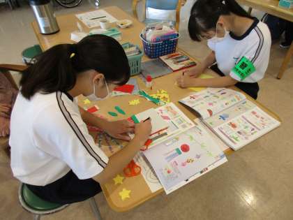 7月7日(木) 2年生「社会に学ぶ『14歳の挑戦』」 公開日 2022/07/07 更新日 2022/07/07 2年生 「はなさき苑」さんでの活動の様子です。 施設内を飾る、七夕飾りを作成していました。 利用者の方にどう話しかけようかなと、考えながら工夫して頑張っているようです。