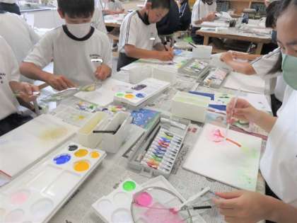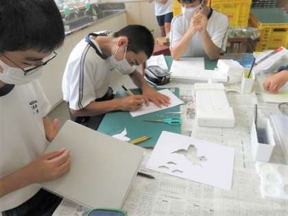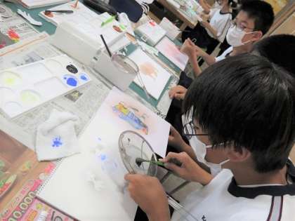 1年2組の美術の授業では、スパッタリングを用いて作品を仕上げています。夏の風物、物語の登場人物などいろいろなテーマの題材にしていました。鳥の羽、魚がつくる波紋など細部にまでこだわる生徒もいました。