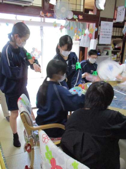 7月8日(金) 2年生「社会に学ぶ『14歳の挑戦』」 公開日 2022/07/08 更新日 2022/07/08 2年生 「おらとこ」さんでの活動の様子です。 利用者の方と一緒にレクリエーションをしました。 テーブルの上に並べたものを、うちわで相手の陣地へ吹き飛ばすゲームのようです。