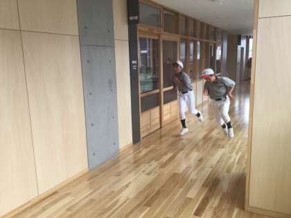 激しく雨が降っていたので、校内でランニング、トレーニングなどしました。