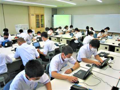 1組は技術。コンピュータソフトを用いて、「14歳の挑戦」の新聞づくりを集中して行っていました。