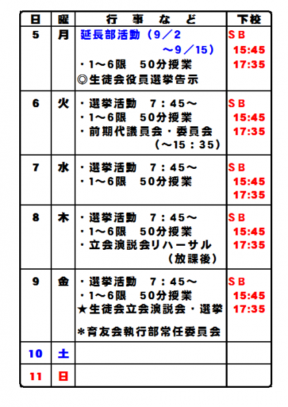 9月5日(月)〜9月11日(日)までのおもな予定です。