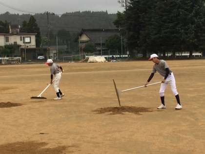先日来の台風による強風の影響で、グランドの砂がすっかり飛んで固い表土が現れていました。このままで練習をするとケガをすることもあります。体育大会のテントに使われた土嚢を運び、グランドの復旧をしました。