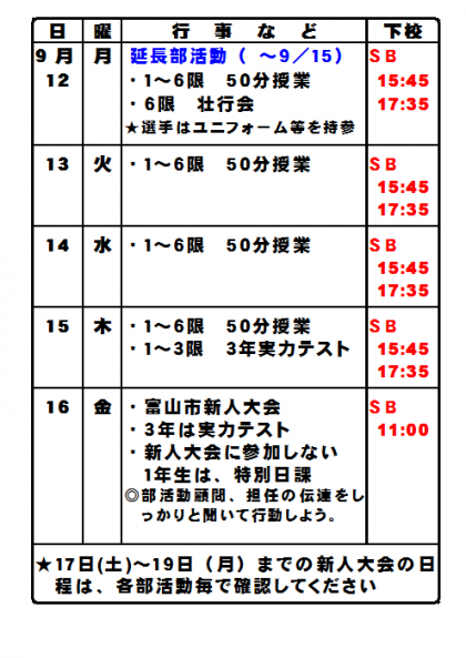 9月12日(月)〜18日(日)までのおもな予定です。