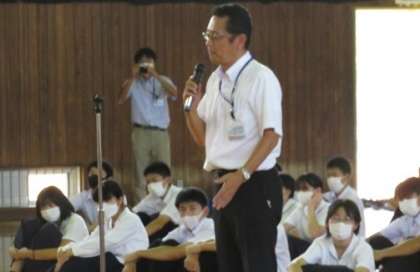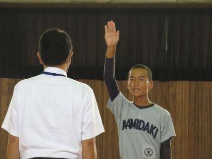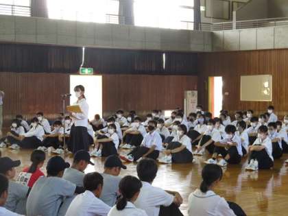 9月12日(月)新人大会壮行会 公開日 2022/09/16 更新日 2022/09/16 お知らせ※2024以前 9月16日(金)から始まる新人大会の壮行会では、生徒会長や校長の激励の言葉。野球部主将の選手宣誓が行われました。