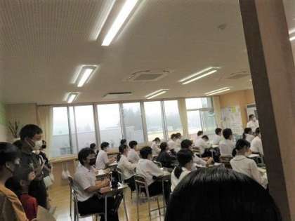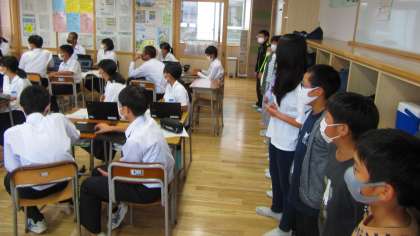 上滝中校区の4つの小学校とその他の区域から入学希望の6年生を3つのグループに分け、密を避けて授業見学してもらいました。小学生の保護者の方には、ベランダから見学していただきました。授業の内容は、小学生にとって、難しかったかもしれませんが、静かに真剣に授業見学していました。
