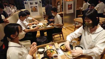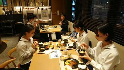 ホテルに到着し、ビュッフェスタイルの夕飯を美味しくいただいています。