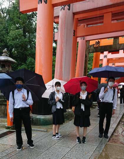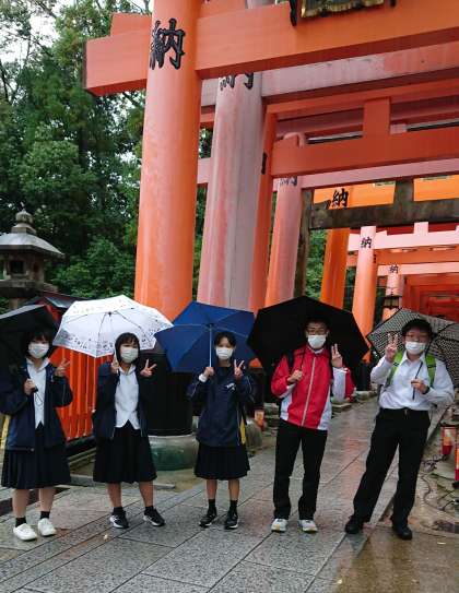 1組は伏見稲荷大社に来ています。有名な千本鳥居に感動しています。