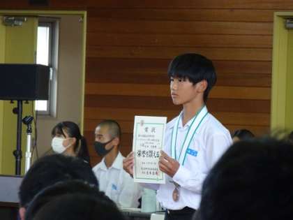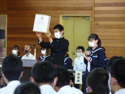 10月14日(金)生徒総会 公開日 2022/10/14 更新日 2022/10/14 お知らせ※2024以前 校長が「半年後の成長を期待する」と生徒総会の講評を述べました。閉会の挨拶は、生徒一人一人の頑張るぞという意気込みを感じる大きな声の挨拶でした。最後に、県ジュニアオリンピック陸上競技大会の男子棒高跳びで3位授賞した2年男子の受賞伝達が行われました。また、安全委員会が、富山南交通安全協会からいただいた反射キーホルダーを披露しました。