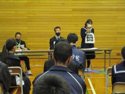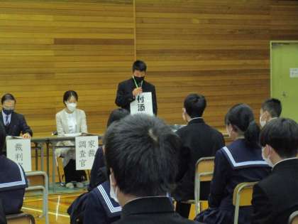 11月4日(金)体育館で、富山地方裁判所、家庭裁判所の皆さんと共に学ぶ機会をいただきました。はじめに、少年事件手続きの流れ等の説明を受け、生徒と教員が、少年や保護者、裁判所書記官等の役割で模擬少年審判の場面を演じてみました。