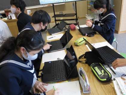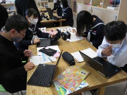 11月15日(火)3年2組 美術 公開日 2022/11/15 更新日 2022/11/15 3年生 エコバックのデザインを考える授業です。コンセプト(だれのため、何のためのデザインか)では、「友を喜ばすため」「人を笑わせるため」「自分が嬉しくなるため」といろいろなことを考えて学習プリントに書いています。生徒の中には、「〜のオマージュ」と言って、クロムブックでデザインを調べていました。