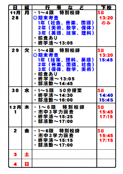 11月28日(月)〜12月4日(日)のおもな予定です。