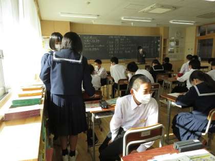 期末考査の後の学級活動では、提出物を出したり、談笑したりする場面が見られます。
