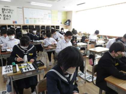 12月12日(月)1年1組 国語 公開日 2022/12/12 更新日 2022/12/12 1年生 書き初めの練習が始まりました。前時は、小筆で名前を練習しました。今日は「世界平和」の初めの二文字だけを書いてみました。