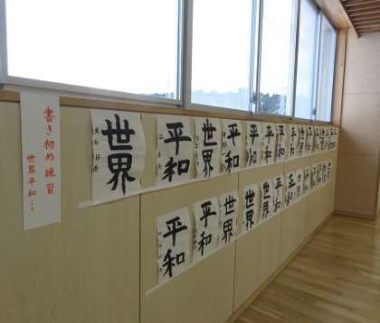 1年生の書き初めの課題は「世界平和」です。少しずつ練習し、名前もだんだんと整ってきました。冬休みに練習して、始業式の書き初め大会では、生徒一人一人が、今までで最上の作品に仕上げるでしょう。