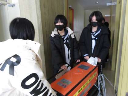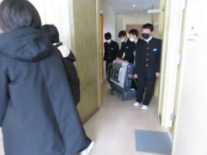 後期生徒会が始まって以来、式の準備も片付けも2年生が担当しています。片付け方も気配りもだんだんと上手になってきました。自分から進んで、きびきびと行動しています。写真は、重たいジェットヒーターを協力して片付けている様子です。