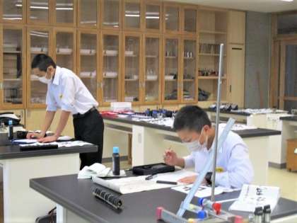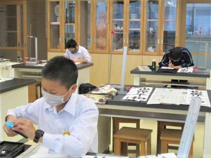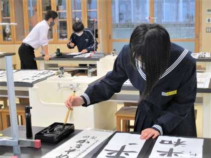 1月13日(金)書写の作品づくり 公開日 2023/01/13 更新日 2023/01/13 1年生 放課後、1年生の書写大会金賞・銀賞の生徒は、市書写展覧会に出品する作品を仕上げています。理科室の広い机を使い、納得するまで書に向かっています。