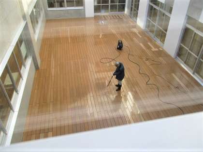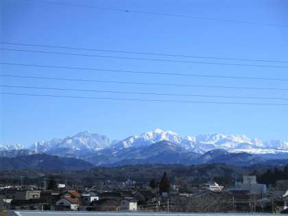今日は晴天なので、3階から見える山々が青空に映えています。 校舎の中庭(バルコニー)を用務員さんが苔が生えないように清掃しています。春になったら、工夫して活用したいと思います。