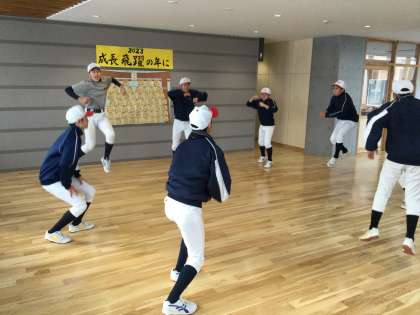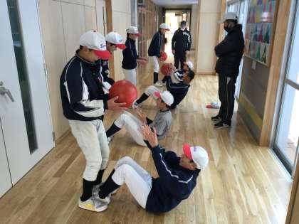 休日の部活動 (野球部) 公開日 2023/01/21 更新日 2023/01/21 部活動 1月20日(土) 昨日は大寒でした。久しぶりに雪が降り、グランドが使えなかったので、校舎内でトレーニングに励みました。