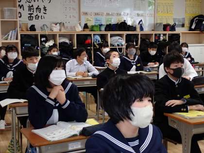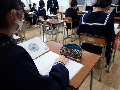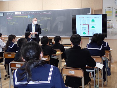 1年2組の英語は、道案内に使うさまざまな表現を学習しています。ALTの先生の単語の発音を聞き取りながら、まねて発音しています。1組のみんなは、元気な声で練習するので、恥ずかしがり屋も英語が苦手な生徒も思いきって大きな声で発音しています。