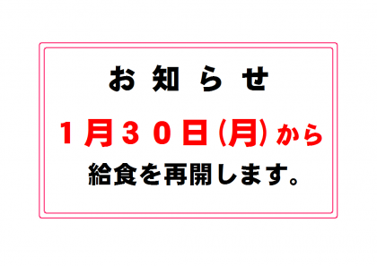 1月26日、27日の二日間の給食中止に伴い、保護者の皆様には弁当持参等の対応にご協力いただきましてありがとうございました。書面でもお知らせしましたが、1月30日(月)から給食再開します。