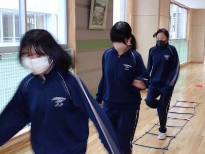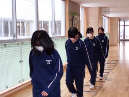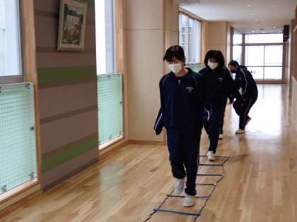 バドミントン部は、ラダーを使って基礎練習をしました。ラダーを用いて、試合につながるフットワーク練習をいろいろと考えながら進めています。オフシーズンでも頑張っています。