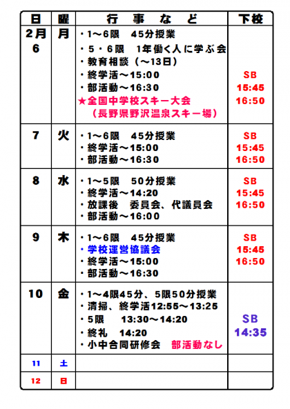 2月6日(月)〜12日(日)の1週間のおもな予定です。
