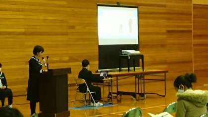 2月3日(金)新入生説明会 公開日 2023/02/03 更新日 2023/02/03 お知らせ※2024以前 生徒会執行部はクイズを入れながら、説明しています。集まった小学6年生は、元気よく手をあげてくれました。